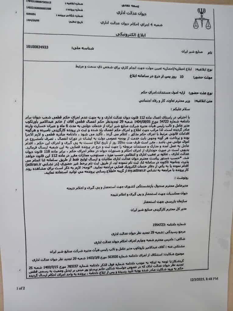 گفتنی است؛ تا زمان تنظیم این گزارش، شرکت صنایع شیر ایران و وزارت تعاون، کار و رفاه اجتماعی واکنش رسمی به اجرای حکم منتشر نکردهاند.