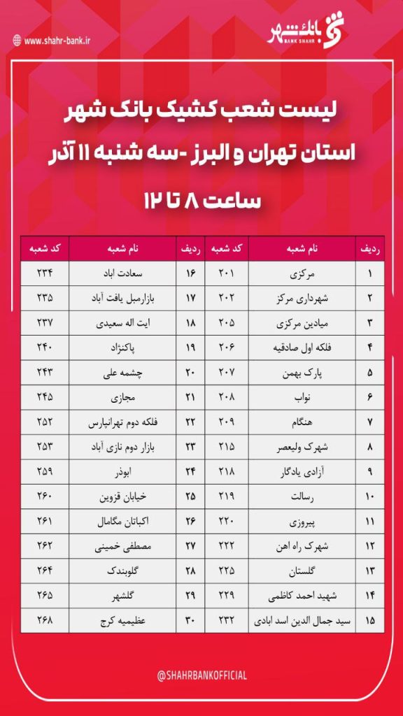 به گزارش روابط عمومی بانک شهر، به دلیل افزایش و تداوم آلودگی هوا در استان تهران، شعب منتخب بانک شهر در روز سه شنبه ۱۱ آذرماه، به صورت کشیک خدمت رسانی می کنند.